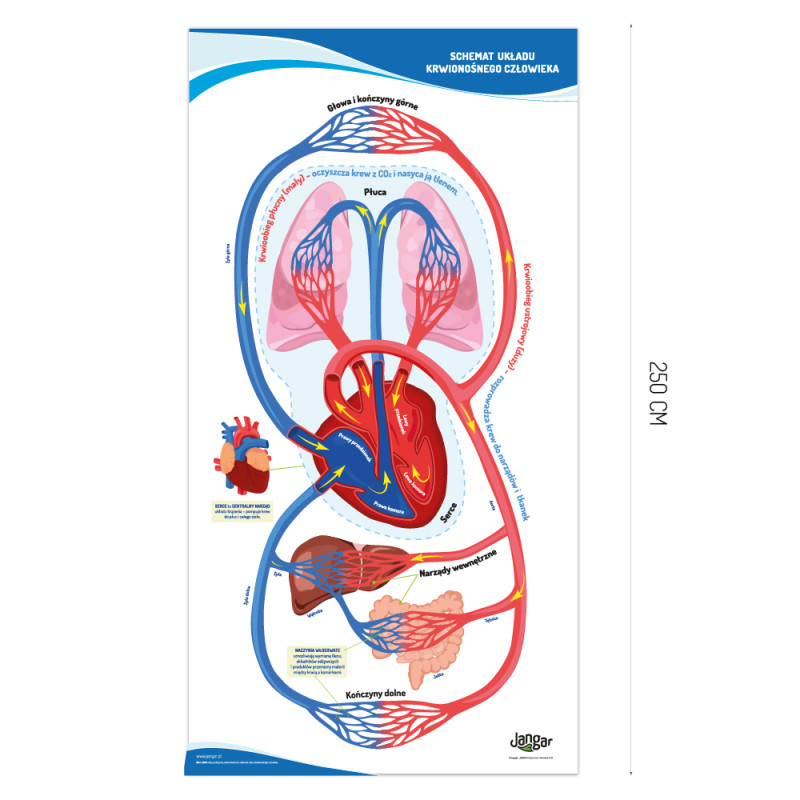 On the surface of the mat you will see a cross-section of the heart, the lungs, and a simplified path of the small and large circulatory loops. The capillaries are also included, and at the bottom of the mat are the liver and intestines as examples of organs reached by blood. The whole is designed to show in an accessible way how blood circulates through the body, where gas exchange takes place, and how all these processes are interconnected.