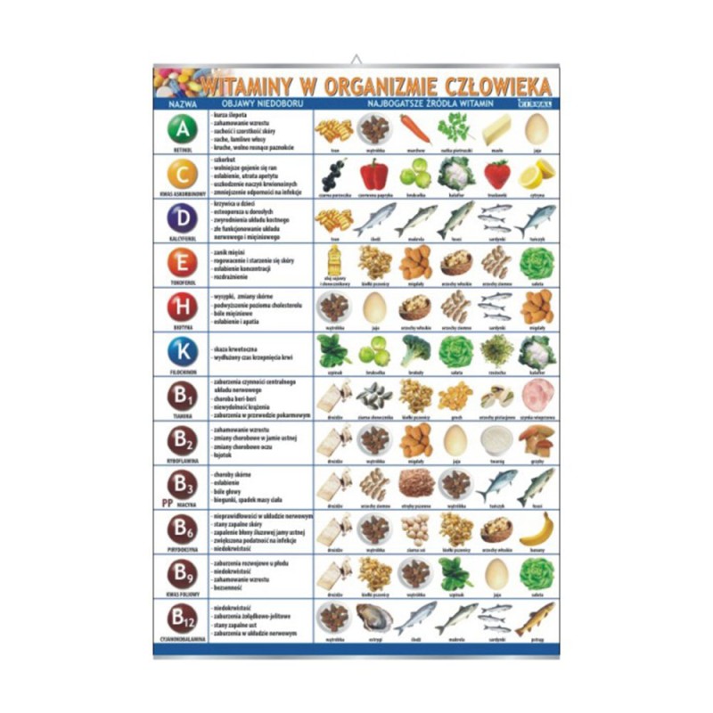 A wall chart measuring 67 x 97 cm that provides information on vitamins essential for the proper functioning of the human body, including dietary sources and the effects of deficiency.