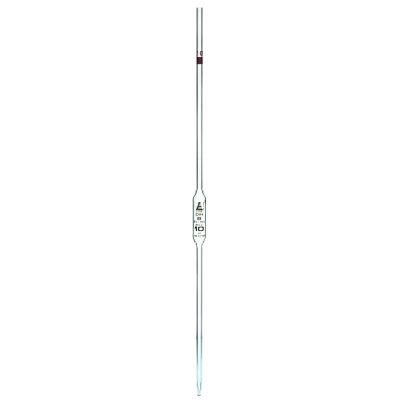 Capacity: 10 ml. Tolerance: ±0.040 ml. Color code: red. Accuracy in accordance with Class B. Conforms to DIN 12690 ISO 648. Dimensions: H = 46 cm (18").