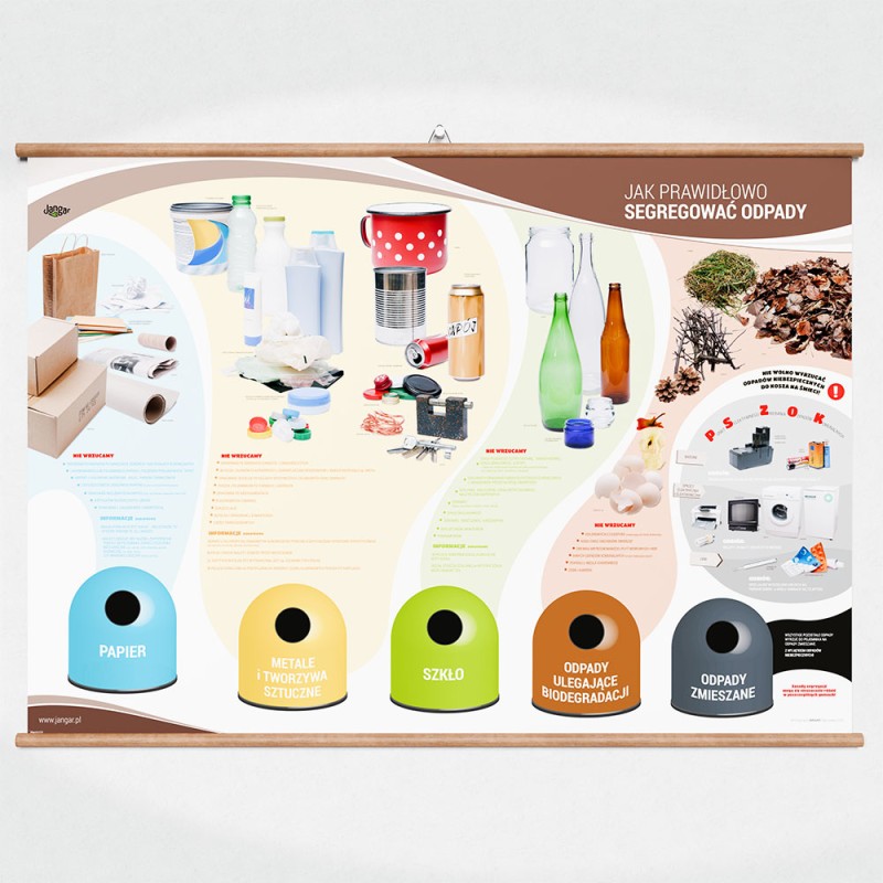 This wall poster vividly presents the types of waste and the correct way to sort them. In addition to realistic photographs (not generic illustrations), under each waste container there are additional tips and sorting guidelines for the given type of waste. For example, for paper, one rule is: "do not throw lacquered or foiled paper, wallpaper." Examples of additional information encouraging correct waste sorting include: "the share of broken glass in the glass melt may reach 75%," "wastes from this group (plastic) are an excellent raw material for producing sports and outdoor equipment."