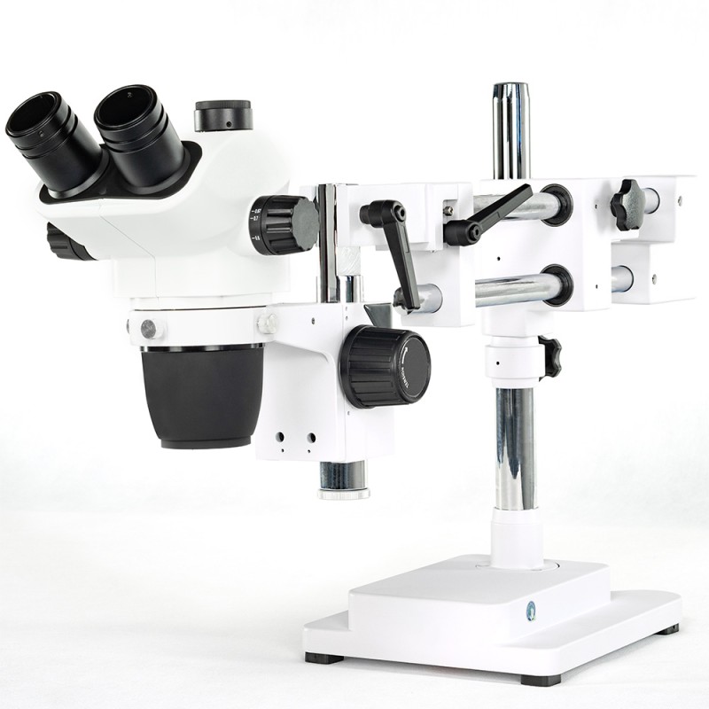 A trinocular stereo microscope with smooth magnification adjustment and a trinocular eyepiece head mounted on a double, adjustable arm with an extendable tube. The tube on a special arm allows studying delicate fragments as well as very large or heavy objects without the need to move or rotate them.