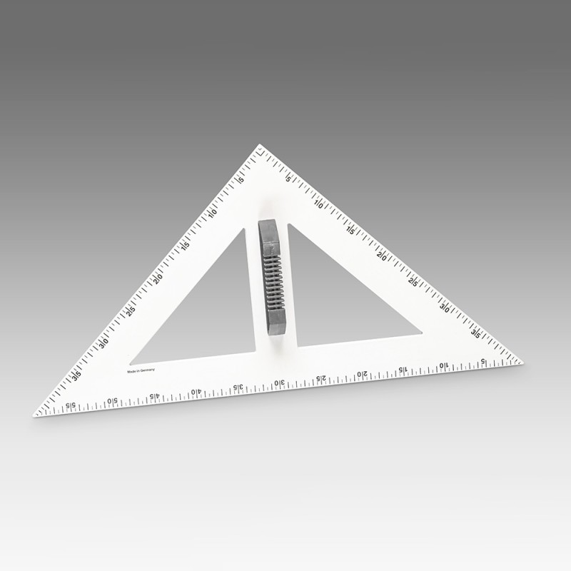 A board set square with 45°, 45° and 90° angles, made of plastic, with a mounted handle. Magnetic version.